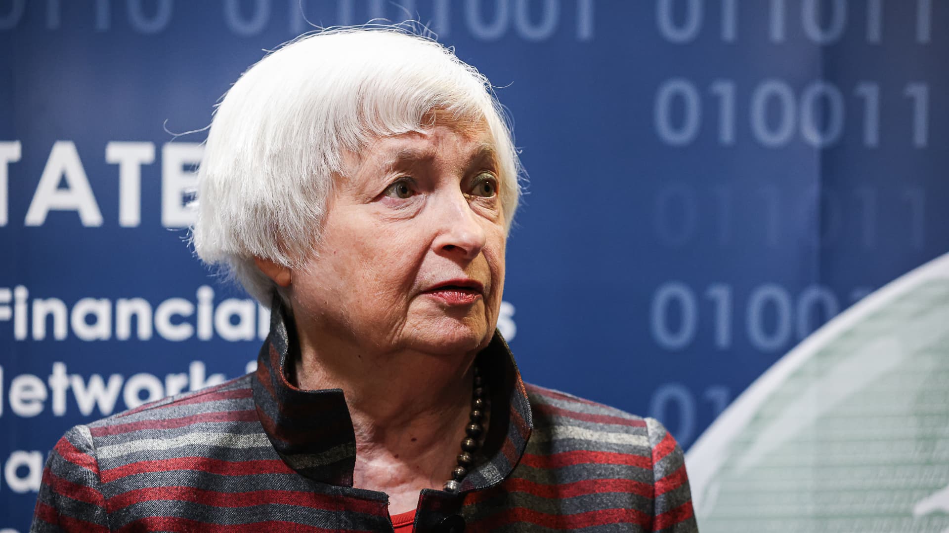 Treasury Secretary Janet Yellen following a tour of the Financial Crimes Enforcement Network (FinCEN) in Vienna, Virginia, on Jan. 8, 2024.